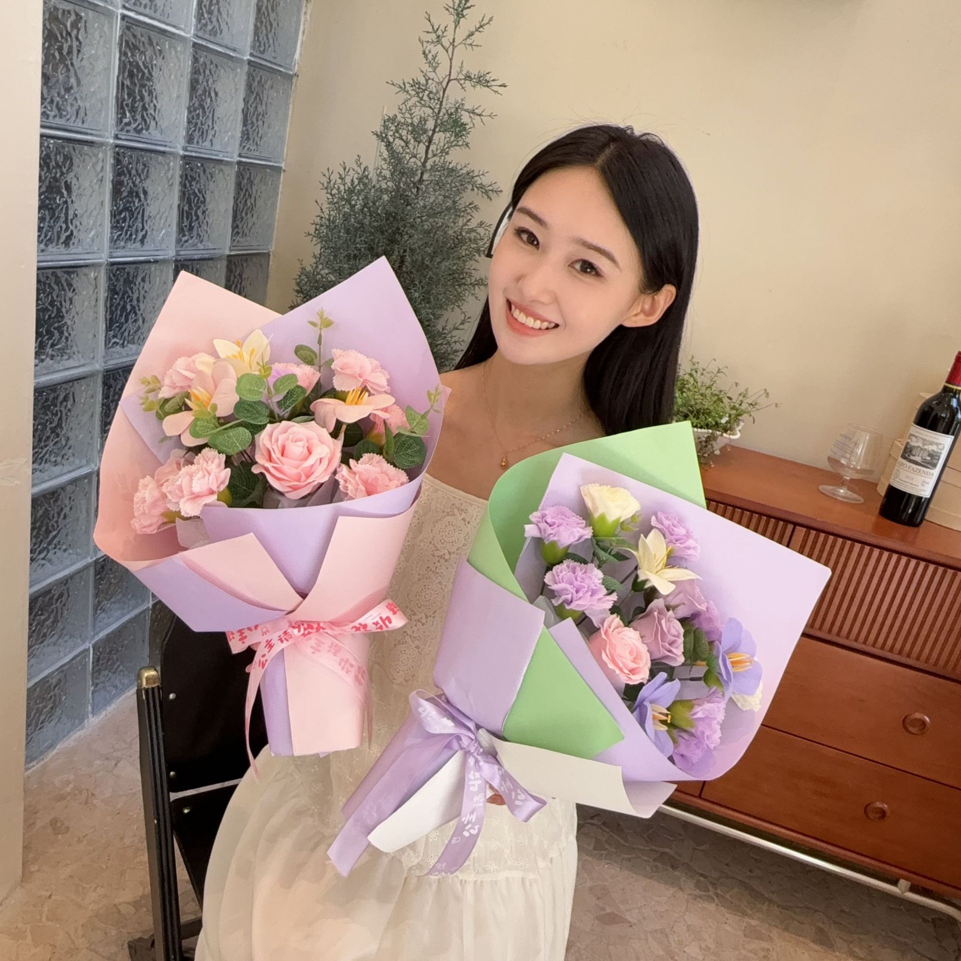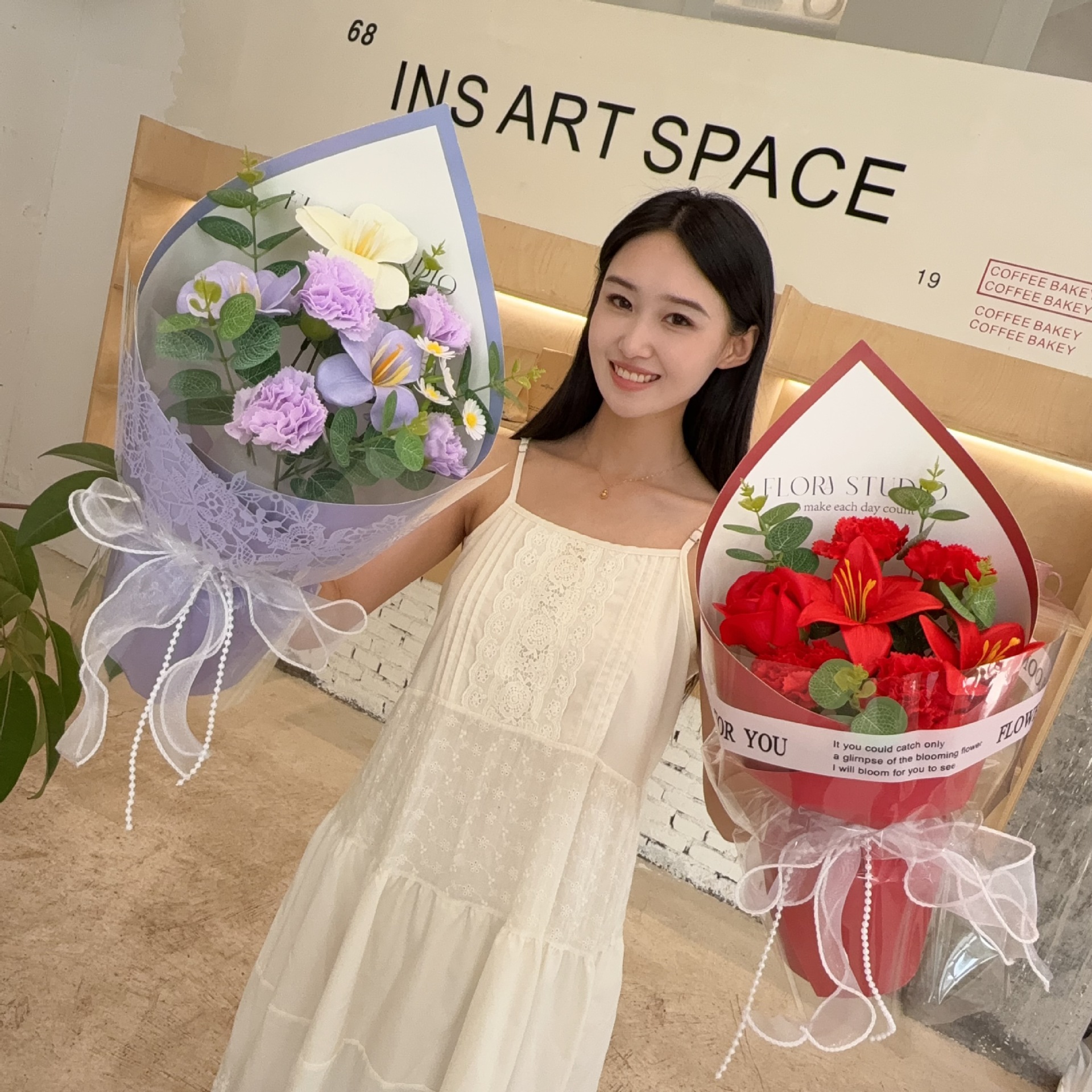 母の日のプレゼントはバラのカーネーション石鹸の花束を持っています。