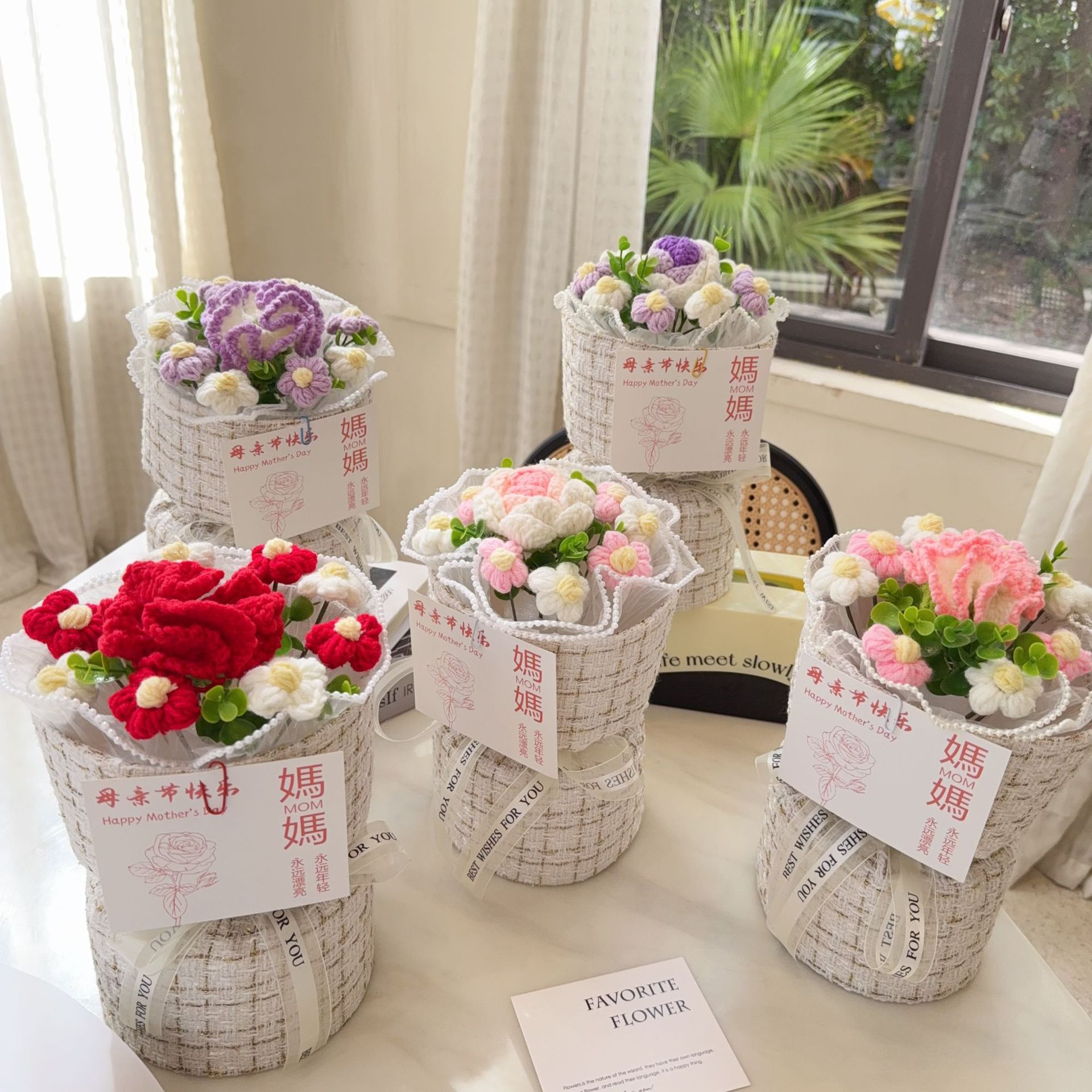 七夕節の贈り物、純手編みの毛糸の花束、カーネーションとハート型の手作り花束、お母様や義母様への心のこもった贈り物
