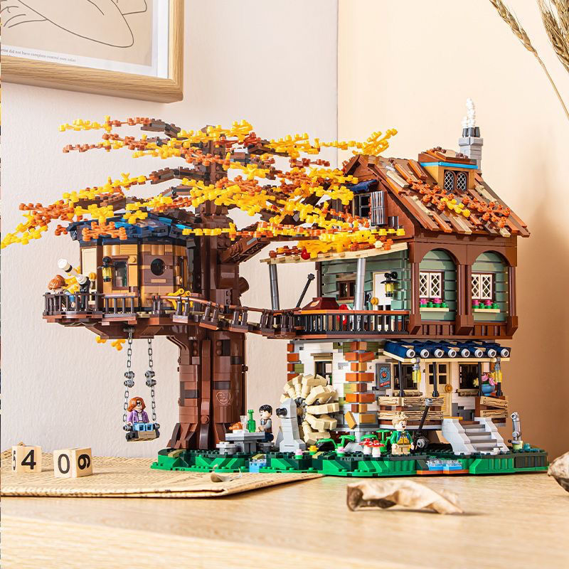 レゴ四季樹屋大人の難易度の高い建物に合わせて積み木の女の子の手でピンクの積み木を飾る