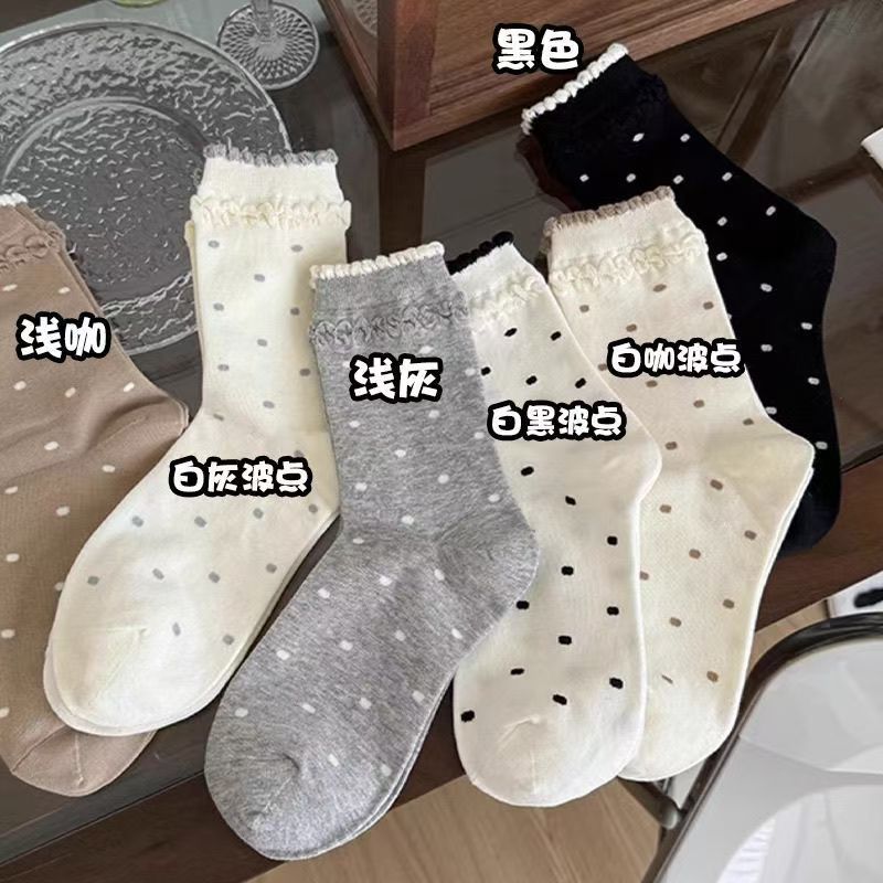 女性用レースパイルソックス、春と秋のミッドチューブ、かわいい日本のレトロな水玉模様の女の子のロングソックス、カレッジスタイルカジュアル
