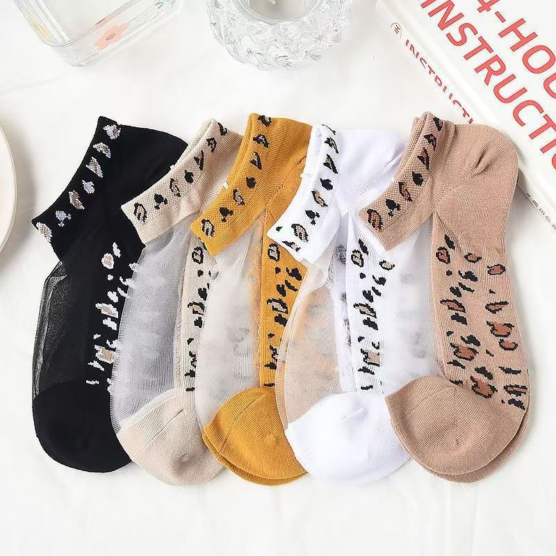 Palanjun クリスタルシルクソックス女性のヒョウ柄ボートソックス夏の靴下イントレンディな多用途透明アイスシルク薄いカーソックス
