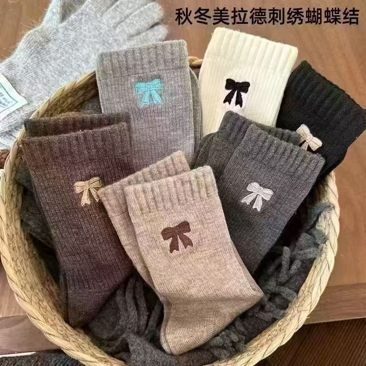 秋冬厚手の女性用ソックス 新作インズ 暖かい秋冬リボンストッキング ミッドカーフソックス レディース 春秋ロングソックス 1