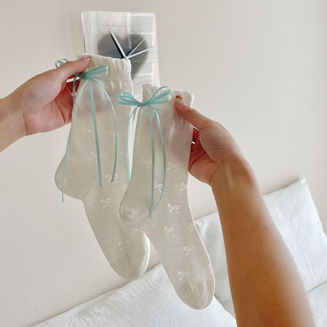 春夏の新型の薄い綿の韓国版の木の耳元の蝶結びのファッション的な中統の靴下の子供の韓国版の百合の積み重ねの靴下