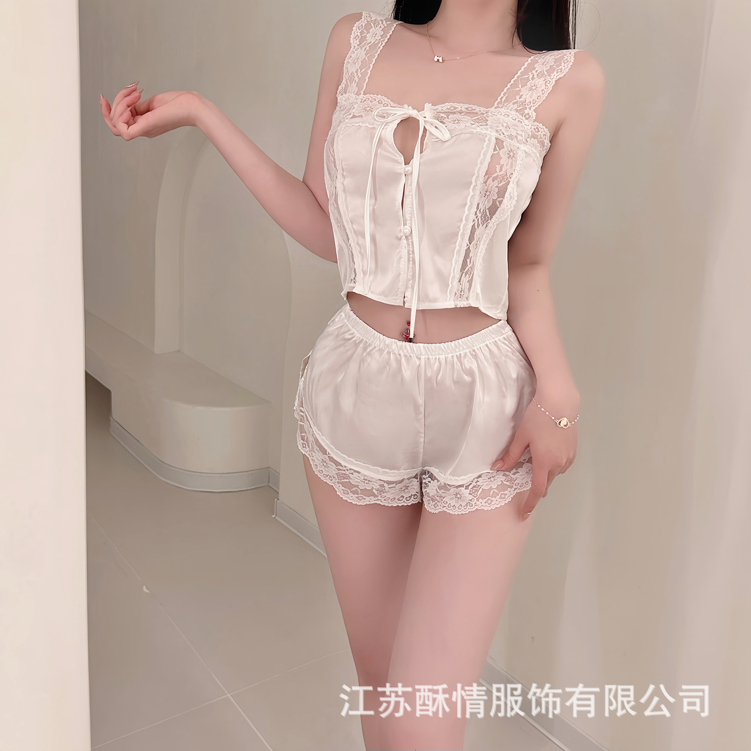 Suiqing 新しいサスペンダーチェリーブラックハートフラワーパジャマショーツスリットセクシーな誘惑純粋な欲望レースショルダーストラップ