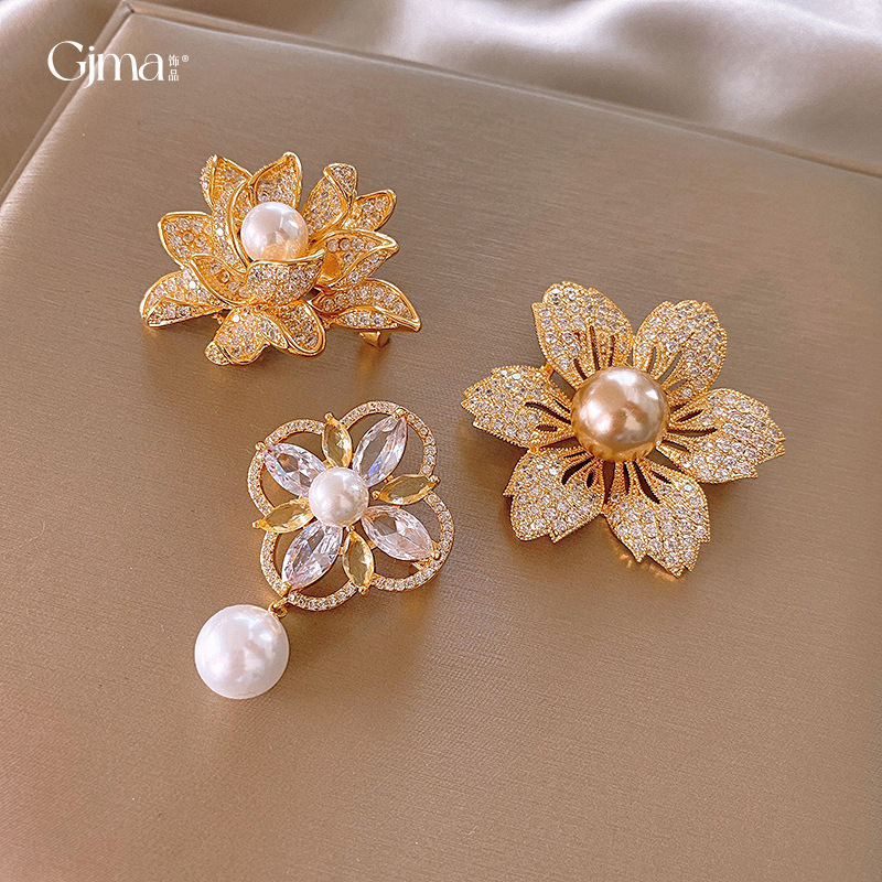 真 � � ゴールドメッキジルコンパール花ブローチファッションピンブローチフレンチ高级感軽く豪华な新作胸饰りレディース