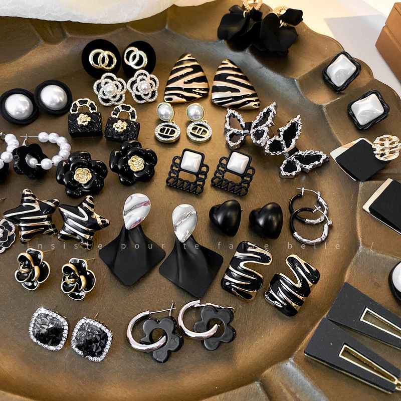 銀の針の復古の黒色はダイヤモンドの蝶の花の真珠のイヤリングの女性のファッションの気質のピアスを入れます。