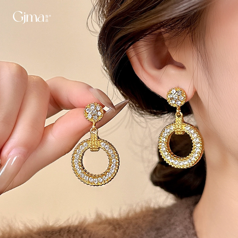 銀針ヨーロピアンスタイルダイヤモンド付き幾何学模様ラウンドイヤリング、ファッショナブルなヴィンテージイヤリング、軽やかな高級感のある女性用イヤリング