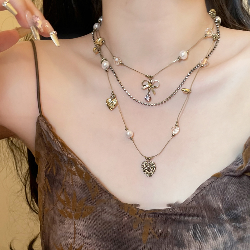 ダイヤモンドの愛の3層の真珠の蝶結びのネックレスを入れます。