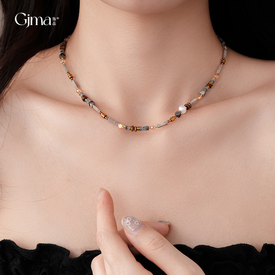 チタン鋼天然石ガラスビーズ竹節ビーズネックレス軽豪華小衆レトロ鎖骨鎖個性気質ネックレス女