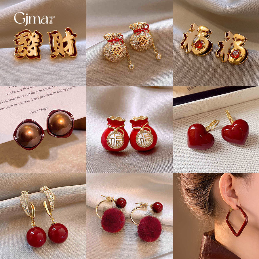 アンコラ赤い滴るオイルラウンドハートピアス新年ファッションセンスピアスレトロ香港風高級感ピアス女性