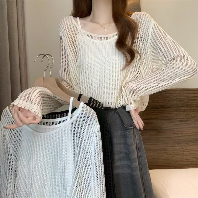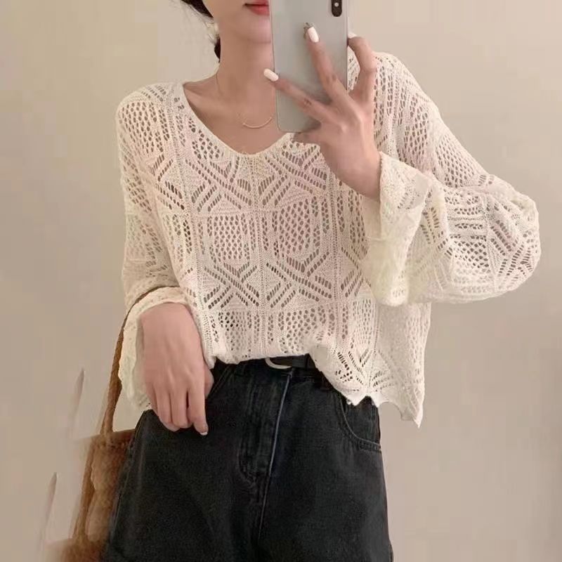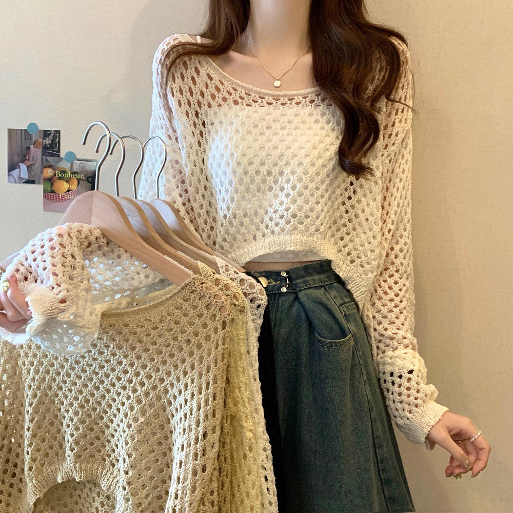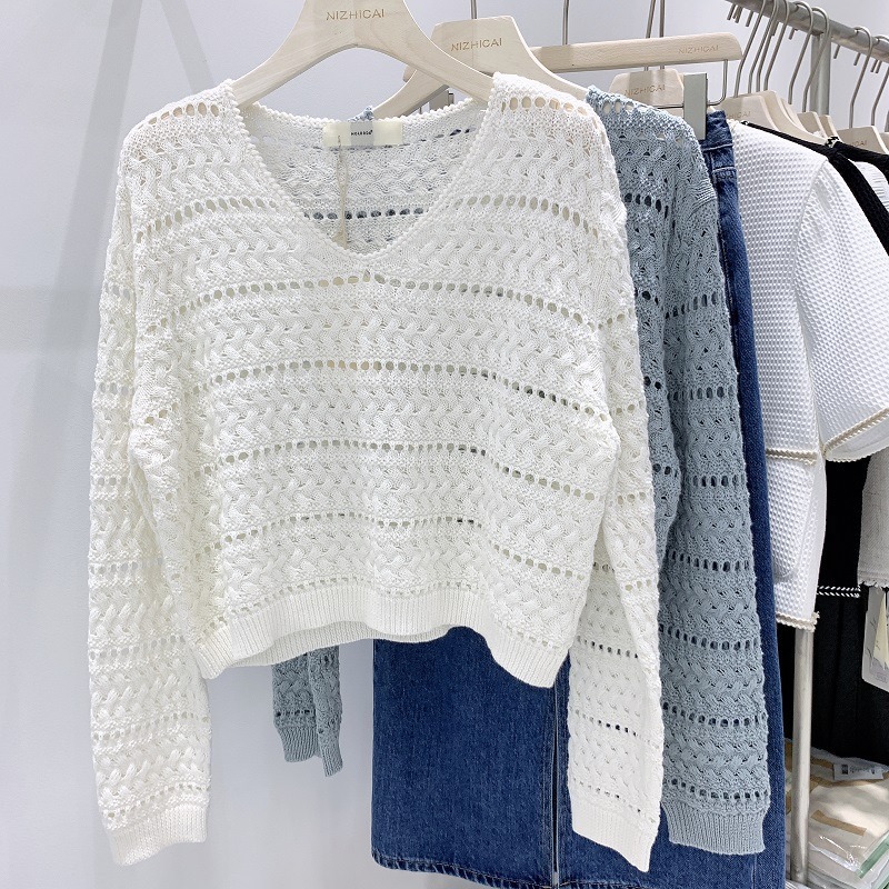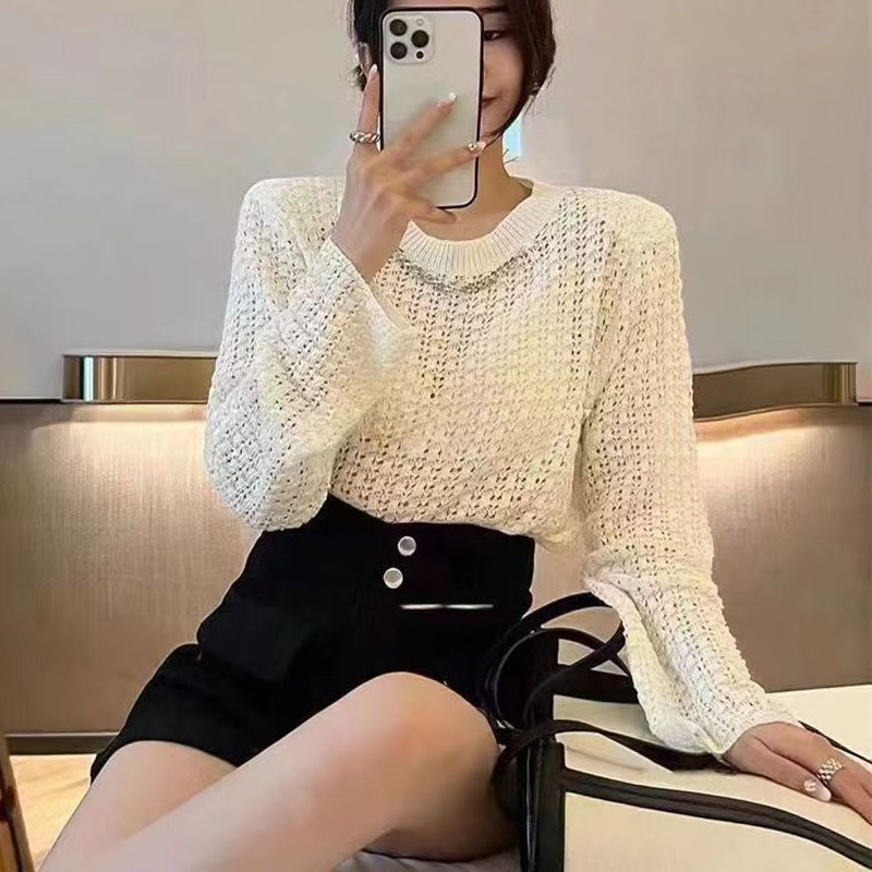 夏の薄手の透かし彫りのシャツの新型の高級感の長袖のニットの韓国版の頭の純色のセーターのエアコンの上着