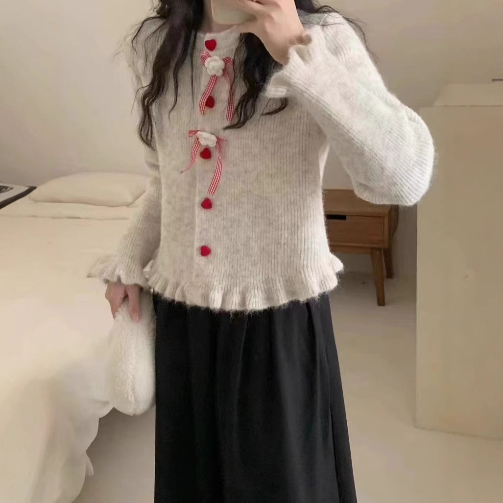 フランス式の小さい香りの蝶結びのセーターの女性の秋冬の新型の気質は木の耳元の丸首のメリヤスのカーディガンのコートを合わせます。