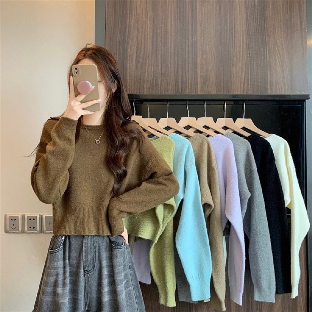 優しくて甘い風の純色の丸首の長袖のニットのカーディガンの上着の女性の春秋の新型のゆったりしていて痩せているセーターの上着が見えます。