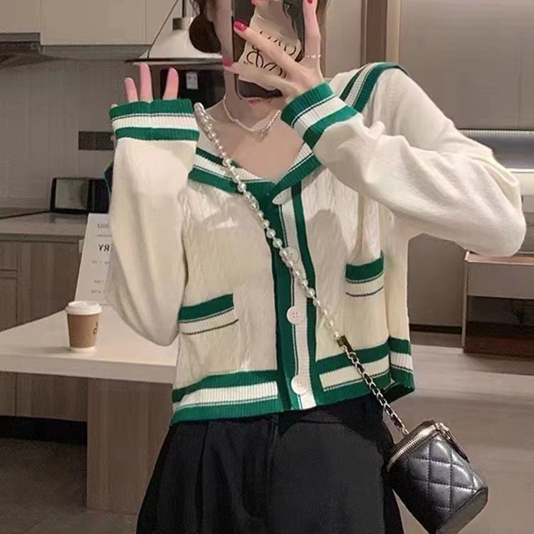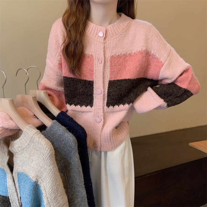 海軍襟デザイン感小香風ニットカーディガン女性秋冬新作コート小衆衝突色ゆるいセーター上着
