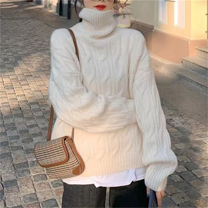 セーターの女性の秋冬の新型の怠惰な風の高い襟の柔らかいモチモチの麻の花のゆったりとした厚いニットの純色のプルオーバーの底のシャツ