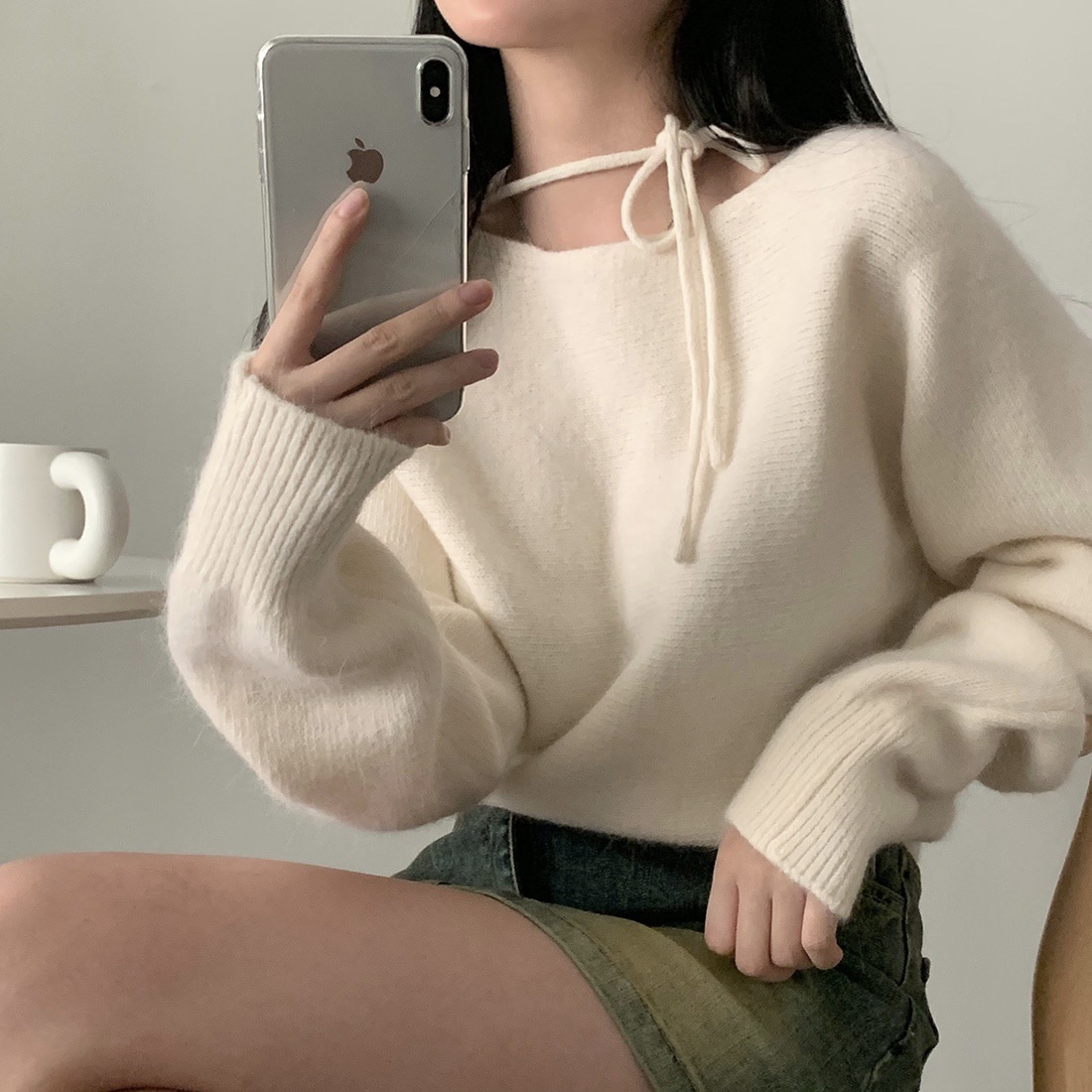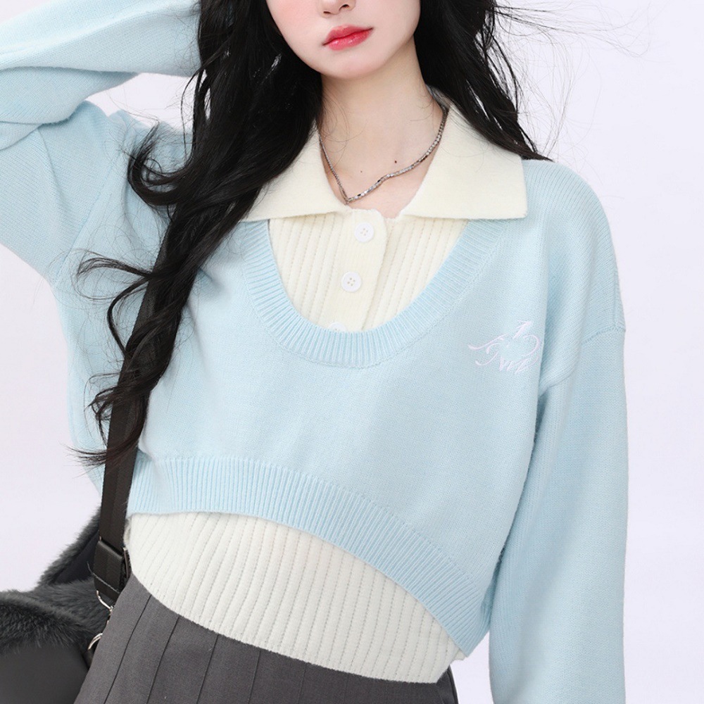 韓国系の怠惰な高級感polo襟のセーターの女性秋冬のゆったりとした襟のニットの2点セットの上着の女性