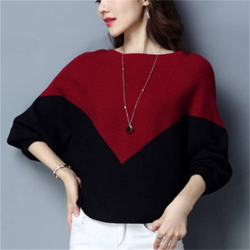 バットスリーブセーター レディース 春秋新作 カラーブロック プルオーバー ゆったり 多用途 ワンショルダー 長袖 ニットインナー