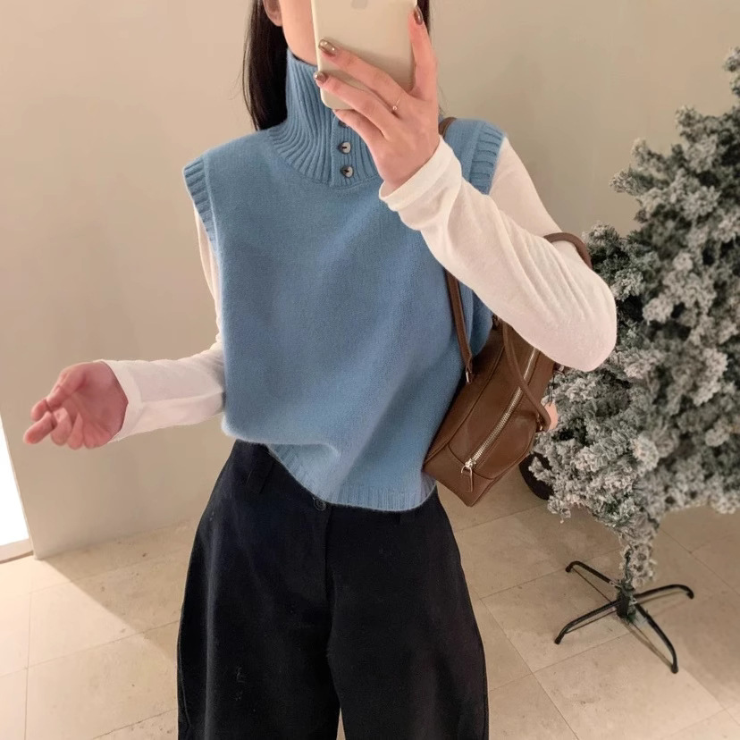 文芸復古風ノースリーブニットベスト春新作韓国系百合純色ボタン立襟セーター女性