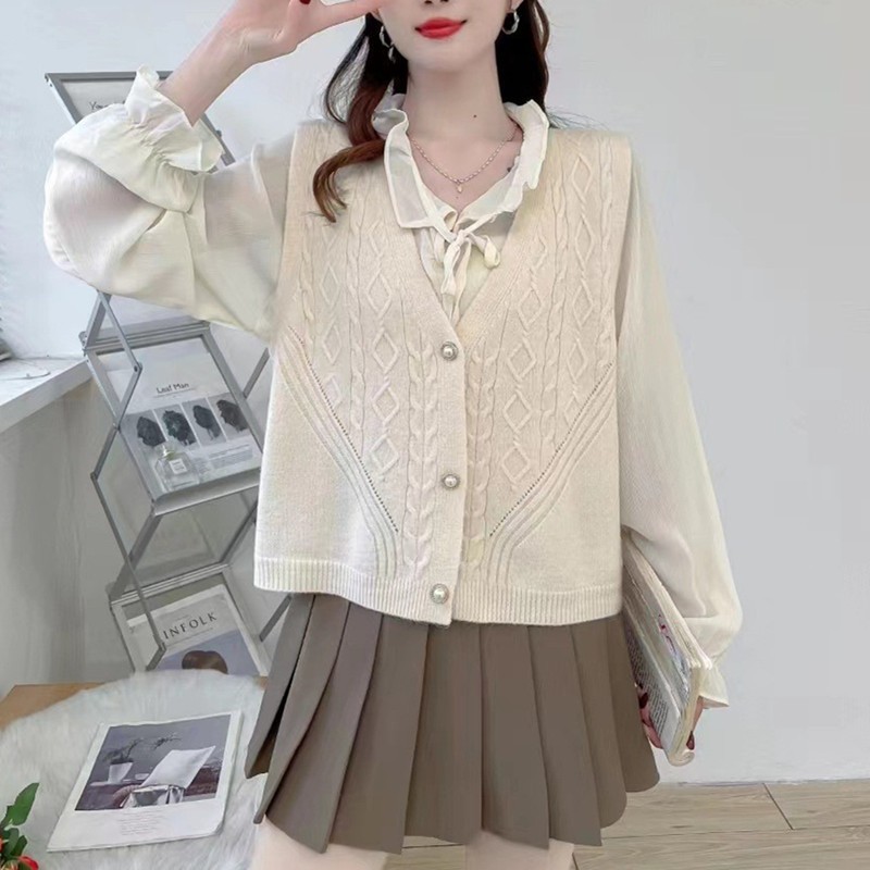 V ネックニットカーディガンベスト女性の春と秋の新スタイル麻柄レイヤード無地ノースリーブアウターファッションセーター