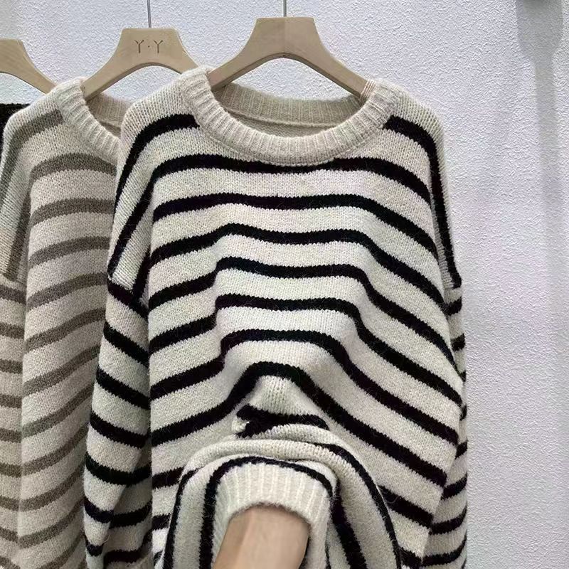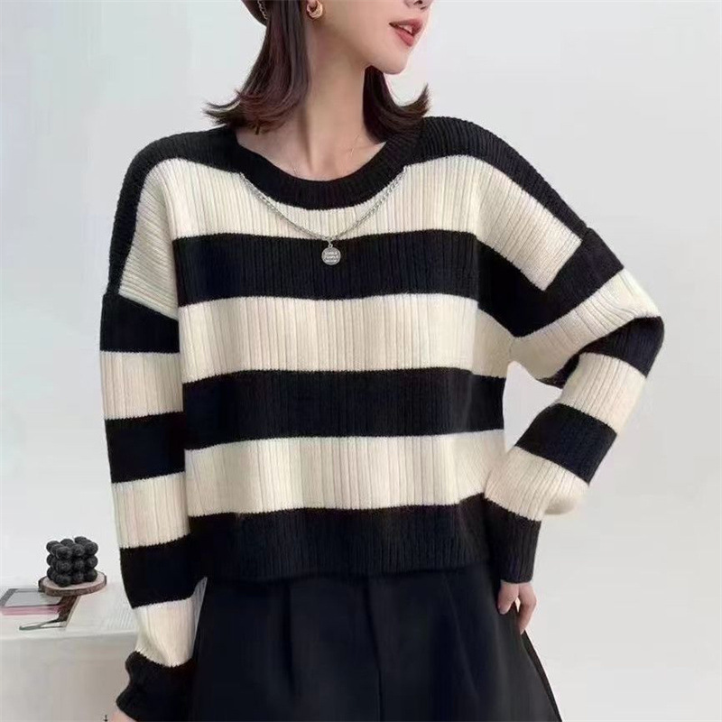 クロスボーダー秋と冬の新しいルーズレイジースタイルファッション韓国スタイルラウンドネックプルオーバーセーター女性のための韓国スタイルストライプスプライシングニット