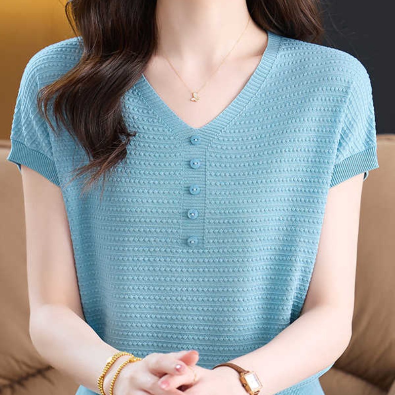 ニット半袖レディース夏の新しいTシャツママファッション多用途Vネックルーズスリムソリッドカラーレディーストップストレンディ