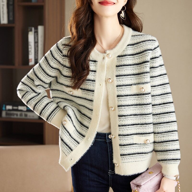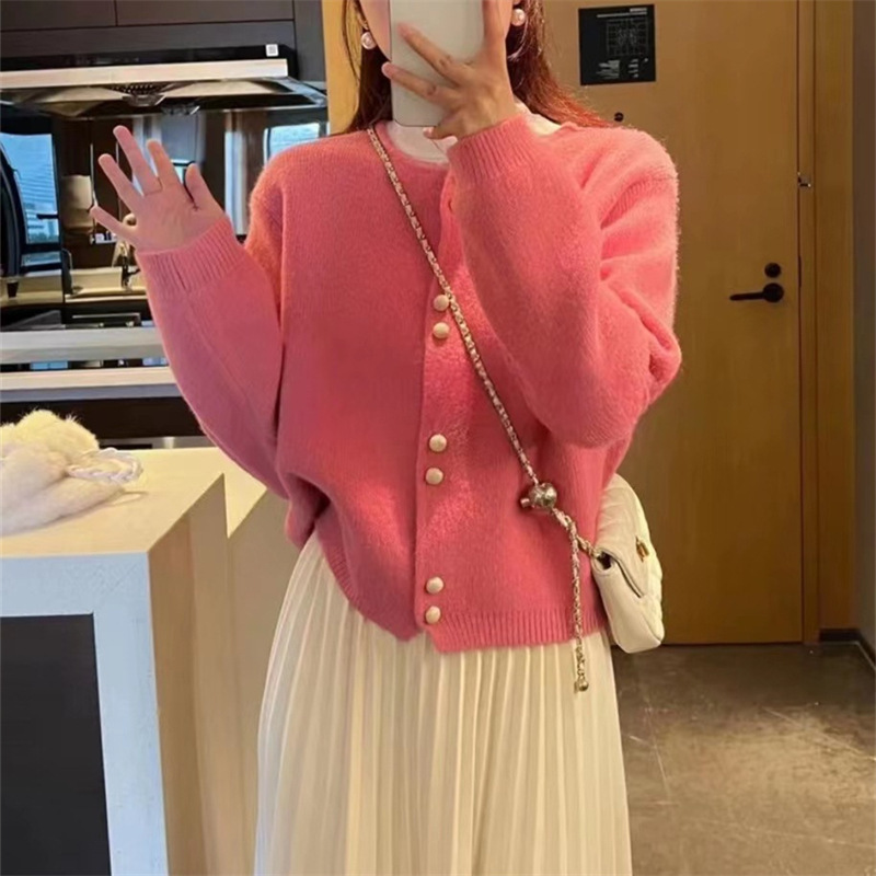 小香風純色ニットカーディガン女性秋冬新作韓国版ゆったりとした甘さ減齢の短い丸首セーターコート