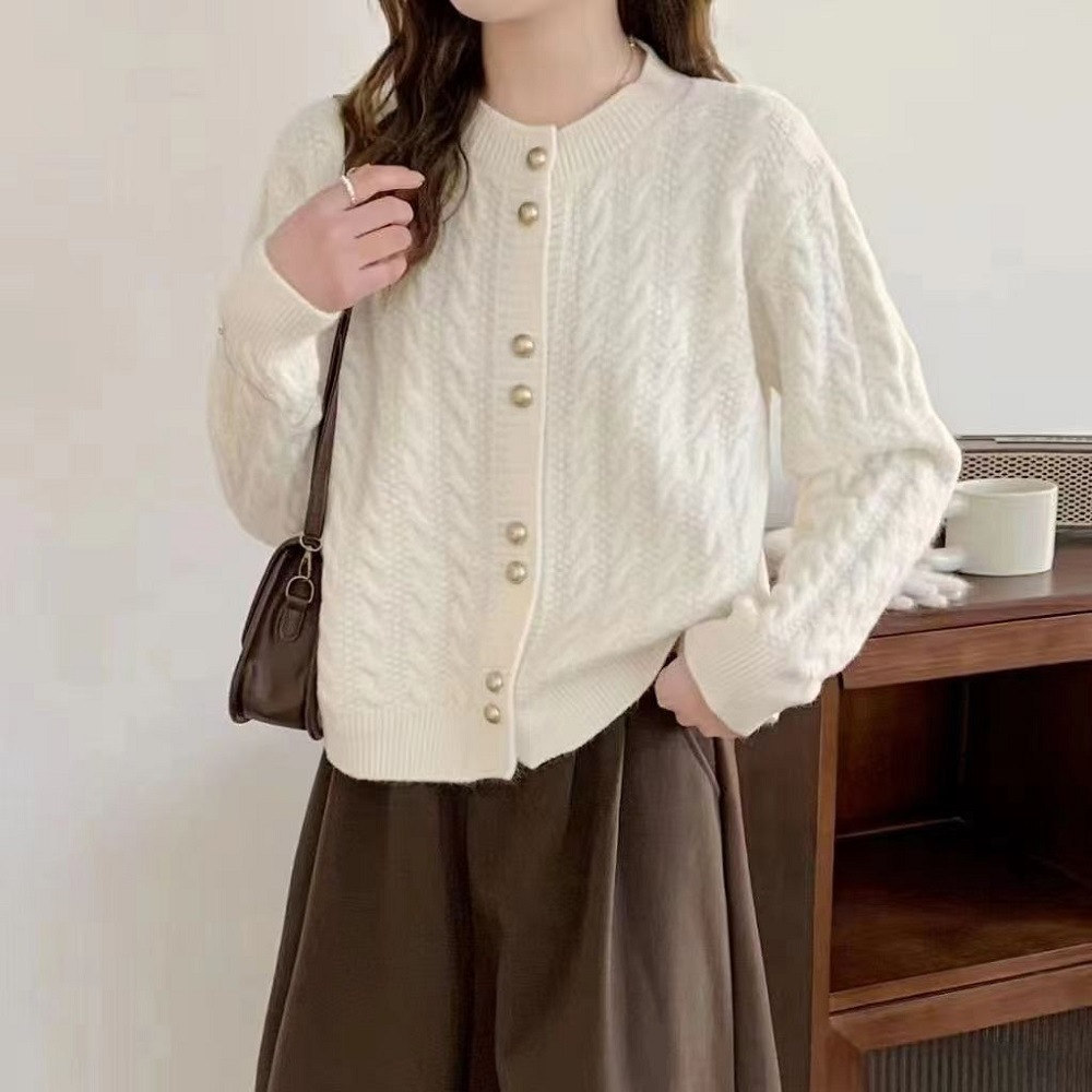 韓国のレトロな麻の花の丸首のニットのカーディガンの高級感の秋の新型の純色のボタンの怠惰な風の上着のコート