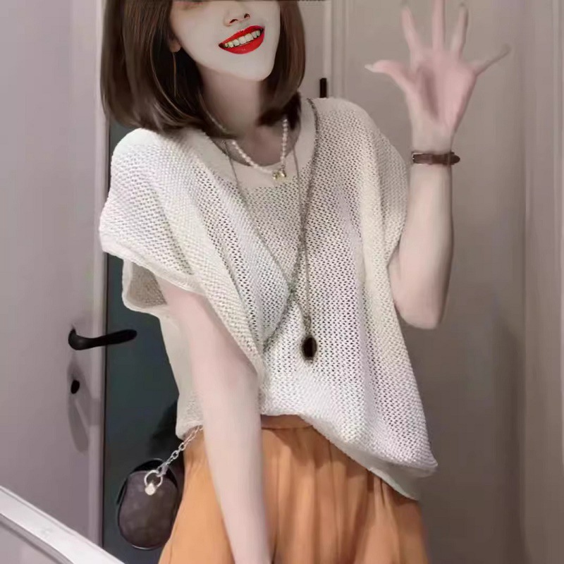 夏の新型ニットの袖なしのセクシーな透かし彫りの女性の薄い上着のギャルの風の純色の百合のゆったりした半袖のtシャツ