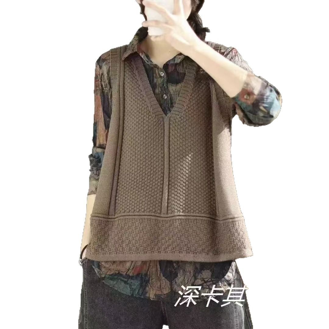 女性用ニットベスト、春と秋の新しいレトロなラウンドネック、ゆったりと多用途、無地のアウターウェア、ファッショナブルなプルオーバーセーターベスト、トレンディ