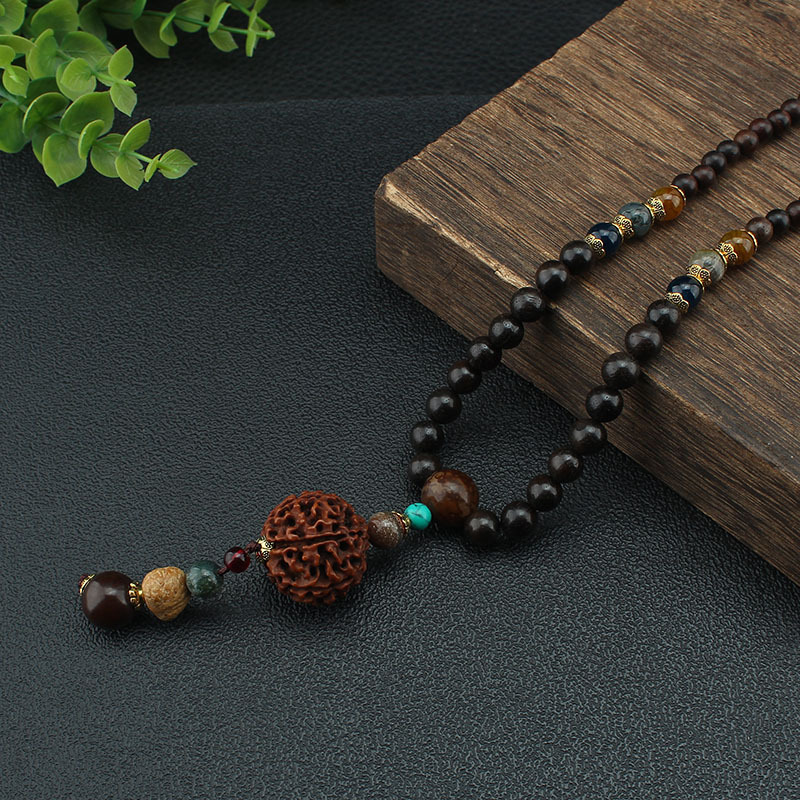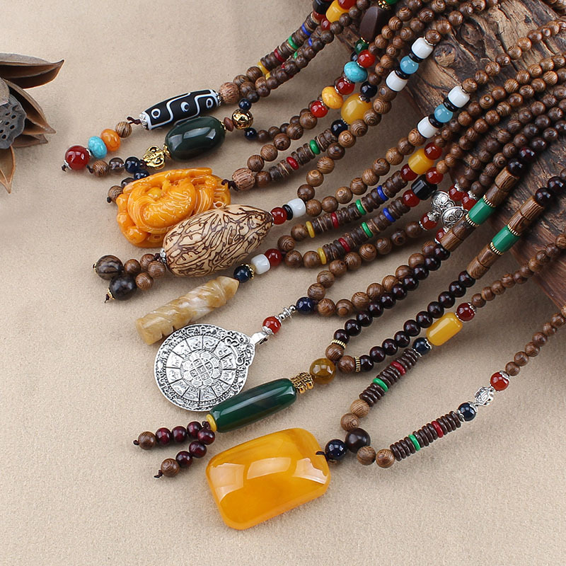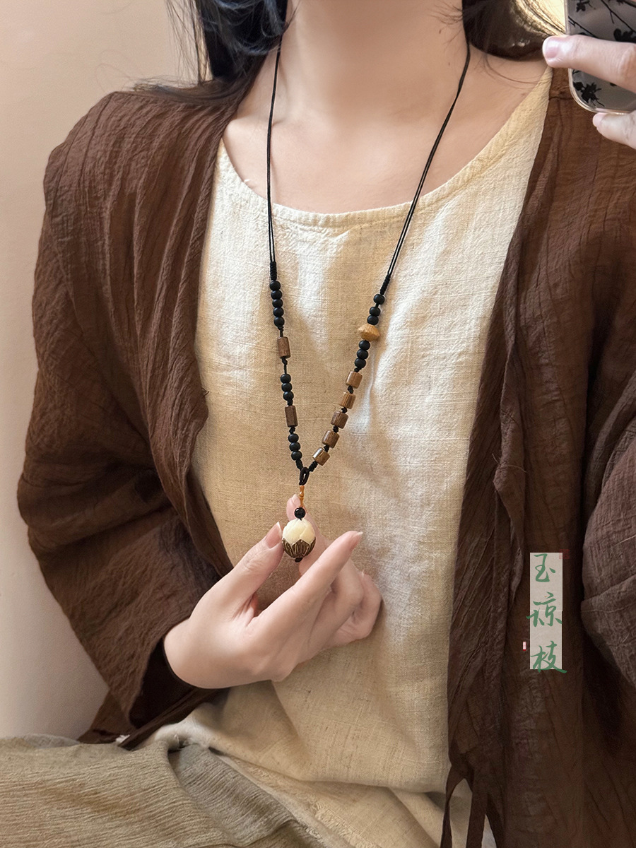 よく売れている民族風金剛菩提檀木ペンダントの長いネックレス女性仏系高級仏珠毛衣チェーン男綿麻