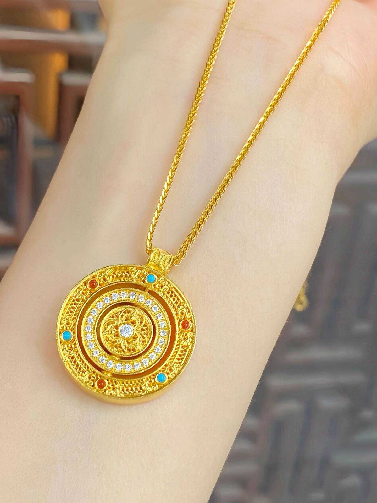 人気の古い法福は黄金色の回転の宝の花の糸のコンパスのネックレスの南の赤い瑪瑙の緑の松石の円盤を満たします。