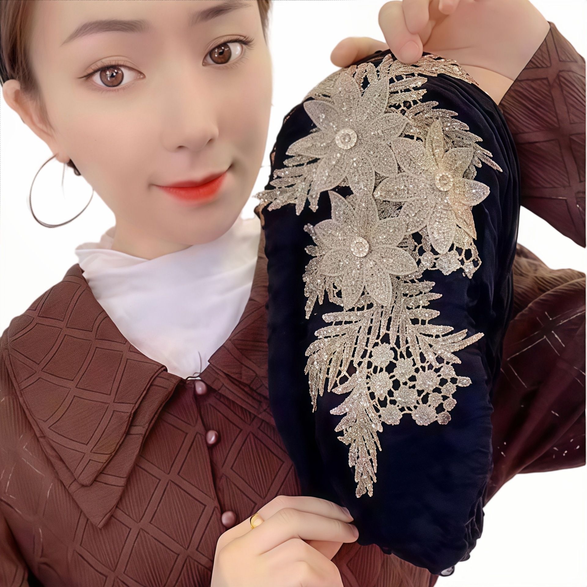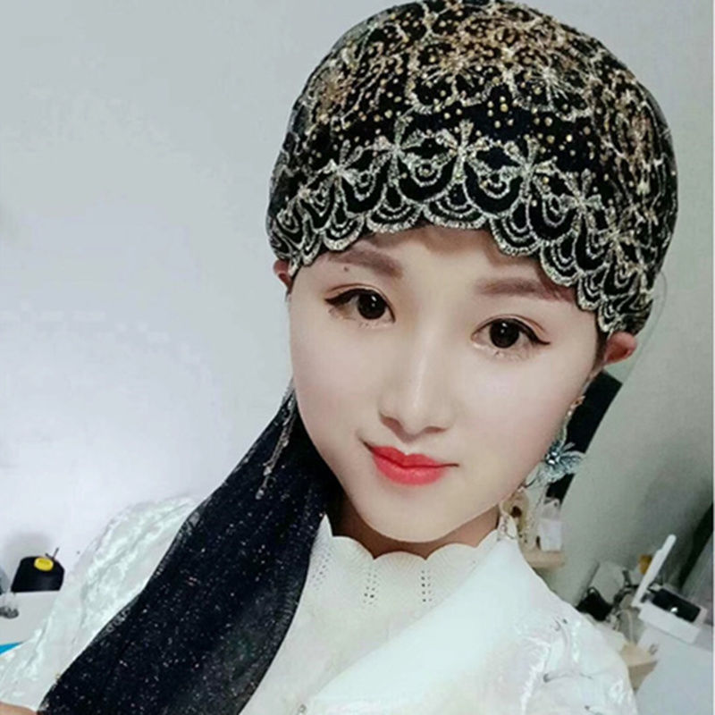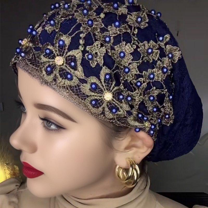 レース金メッキレディースヒジャブ帽子、レースバックフラワーバンダナ、白髪をカバーするファッショナブルなヒジャブ、ヘアバンド帽子、ホームハット