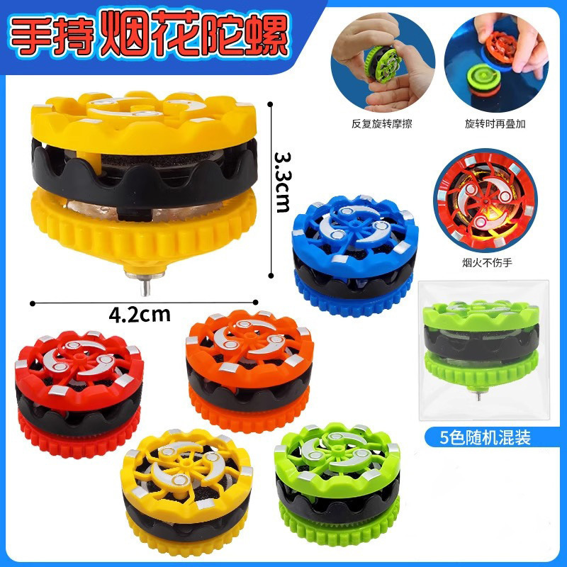 ネットの赤い発光の火の石のこまのおもちゃの指先は回転してまぶしい火花の花火の子供の男の子と対戦して贈り物を解凍します。