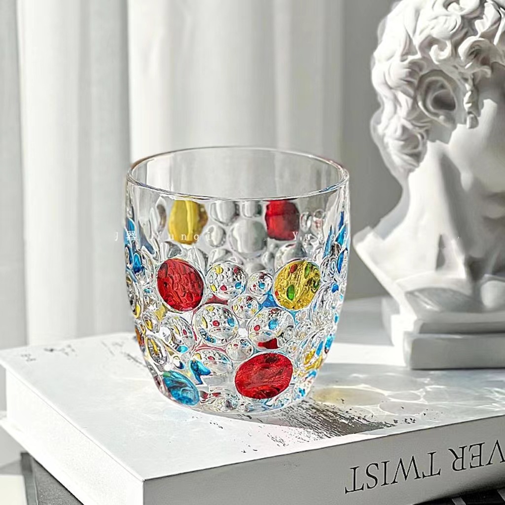 イタリアのデザイナーの色絵の丸い水晶のグラスのコップのアイデアは色のウイスキーの杯のジュースの杯の卸売りにぶつかります。