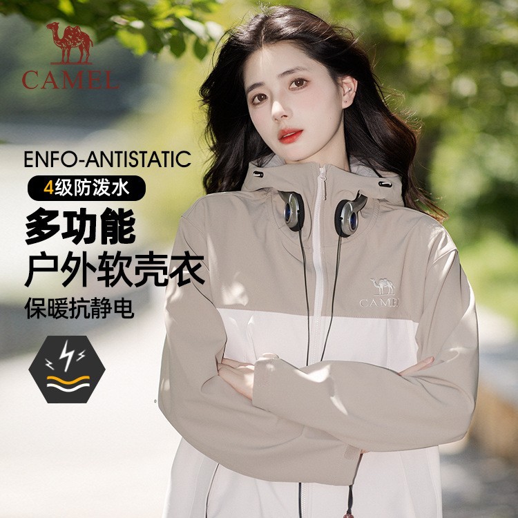 キャメルアウトドアソフトシェルジャケット男性と女性のベルベットジャケット 2025 春と秋の新防水防風ジャケットフード付き登山ジャケット