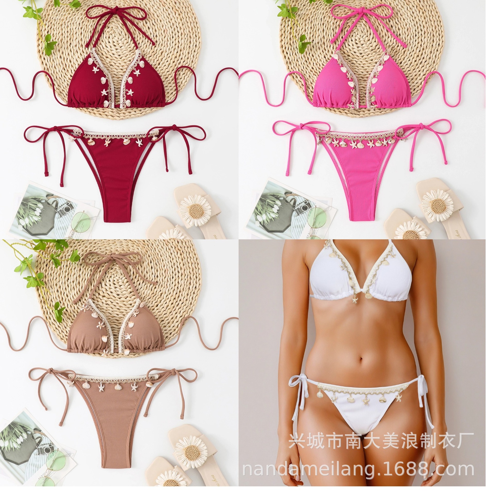 欧米の水着の女性2025の新型のストラップは首の三角カップのビーチのセクシーな水着のアマゾンのビキニの貝殻を掛けます。