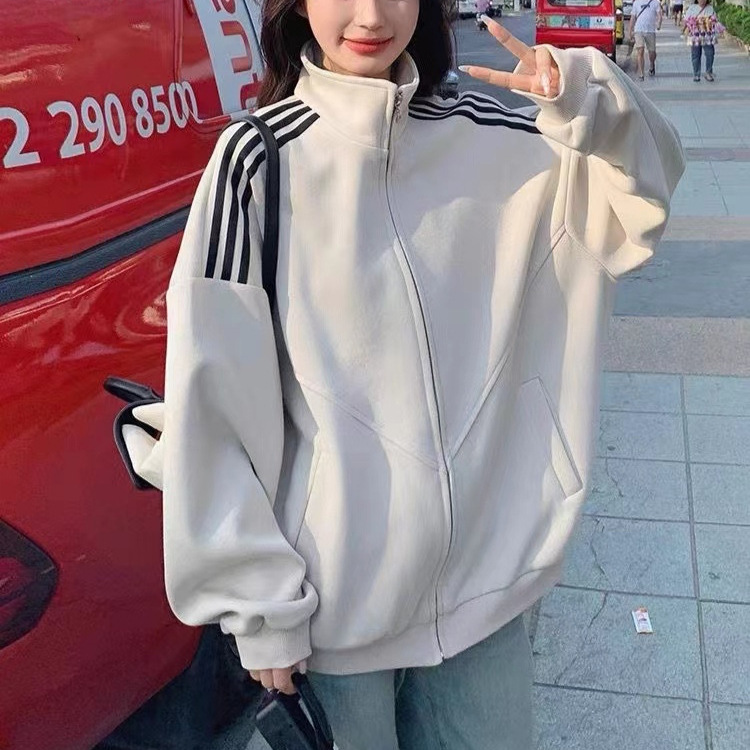 クロスボーダー ジップアップ スウェットシャツ レディース 三本ライン スタンドカラー ミドル丈 2025年新作 フリース裏地付き フードなし
