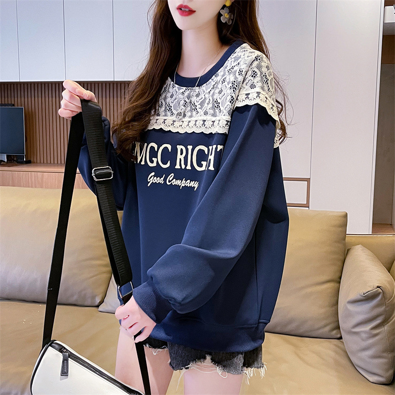2025年春秋新作、アメリカ風レース切り替えスウェットシャツ、ゆったり大きいサイズ、レタープリント、ラウンドネック、女性用、卸売