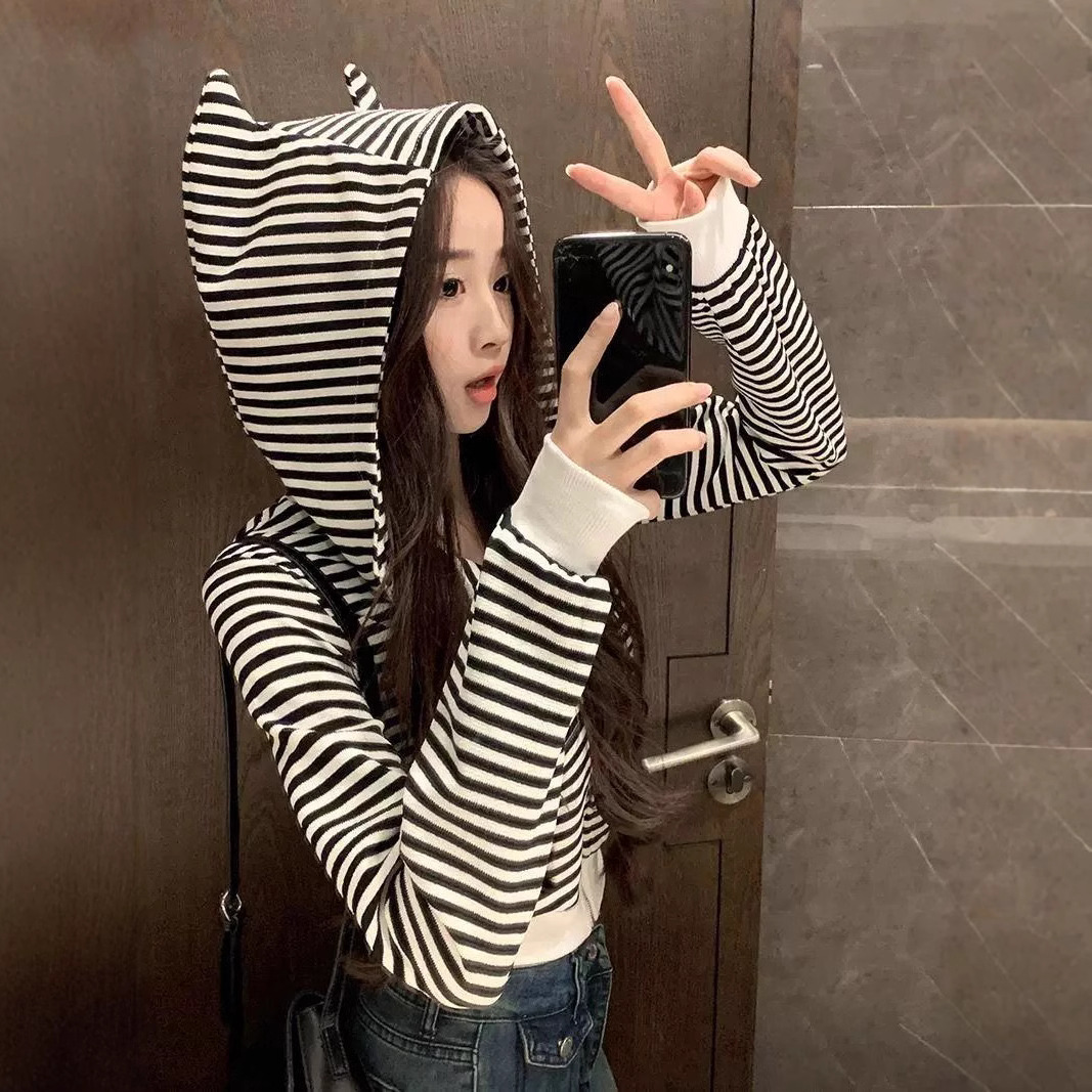 秋の小悪魔のストライプのコートの女性のデザイン感は色のストライプの春秋の韓国系の短いタイプの帽子のジッパーの女性にぶつかります。