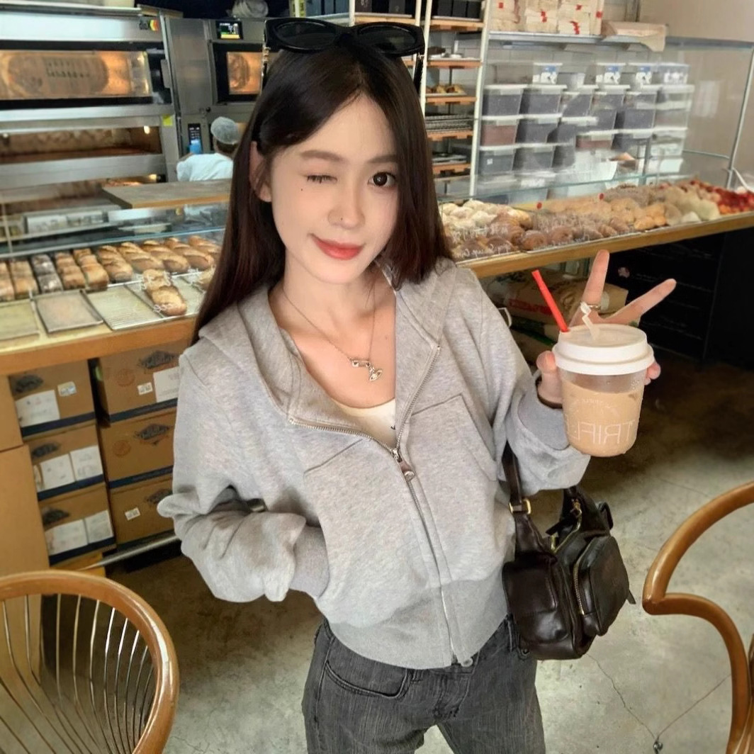 クロスボーダーの灰色のフード付きの女性のショートスタイルの修身春と秋の新型2025長袖の小さい子供のカーディガンのファスナーのコート