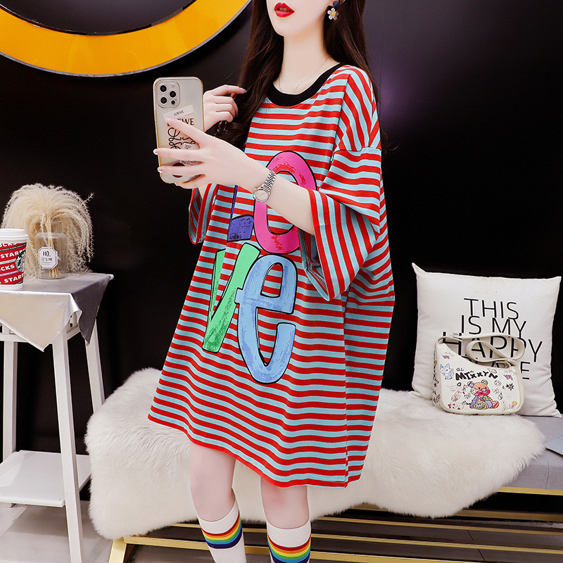 国境を越えた縞模様のtシャツの女性2024夏の中の長いデザイン感のアルファベットの丸首の高級感の半袖tシャツの女性の卸売り