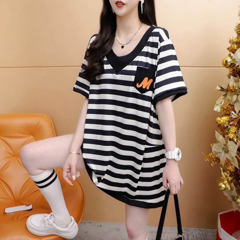 クロスボーダーVネックTシャツレディース半袖ストライプゆったり大きいサイズ痩身高級感2025夏新作ミドル丈トップス