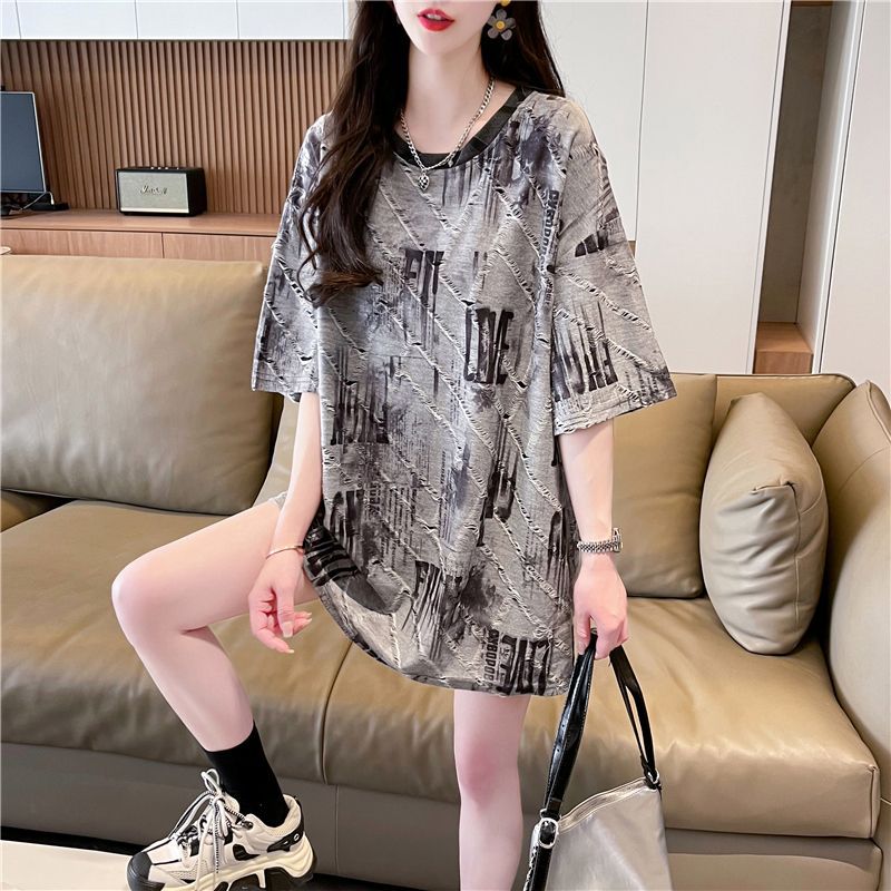 ヨーロッパの大きいバージョンのミドル丈半袖Tシャツレディース夏服2025新しいゆったりお尻カバーファッショナブルなタイダイトップトレンディ