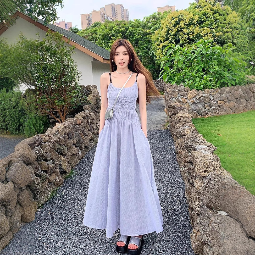 ブルーサスペンダードレスレディース夏2025新しいフレンチシーサイドリゾートスタイルビーチウエストロングスカート