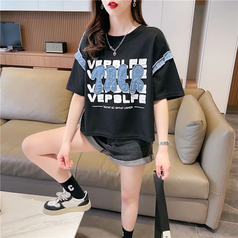 クロスボーダーデニムスプライシングTシャツレディースデザインレターラウンドネックゆったり大きいサイズ年齢軽減レイジースタイル半袖トップス女性用