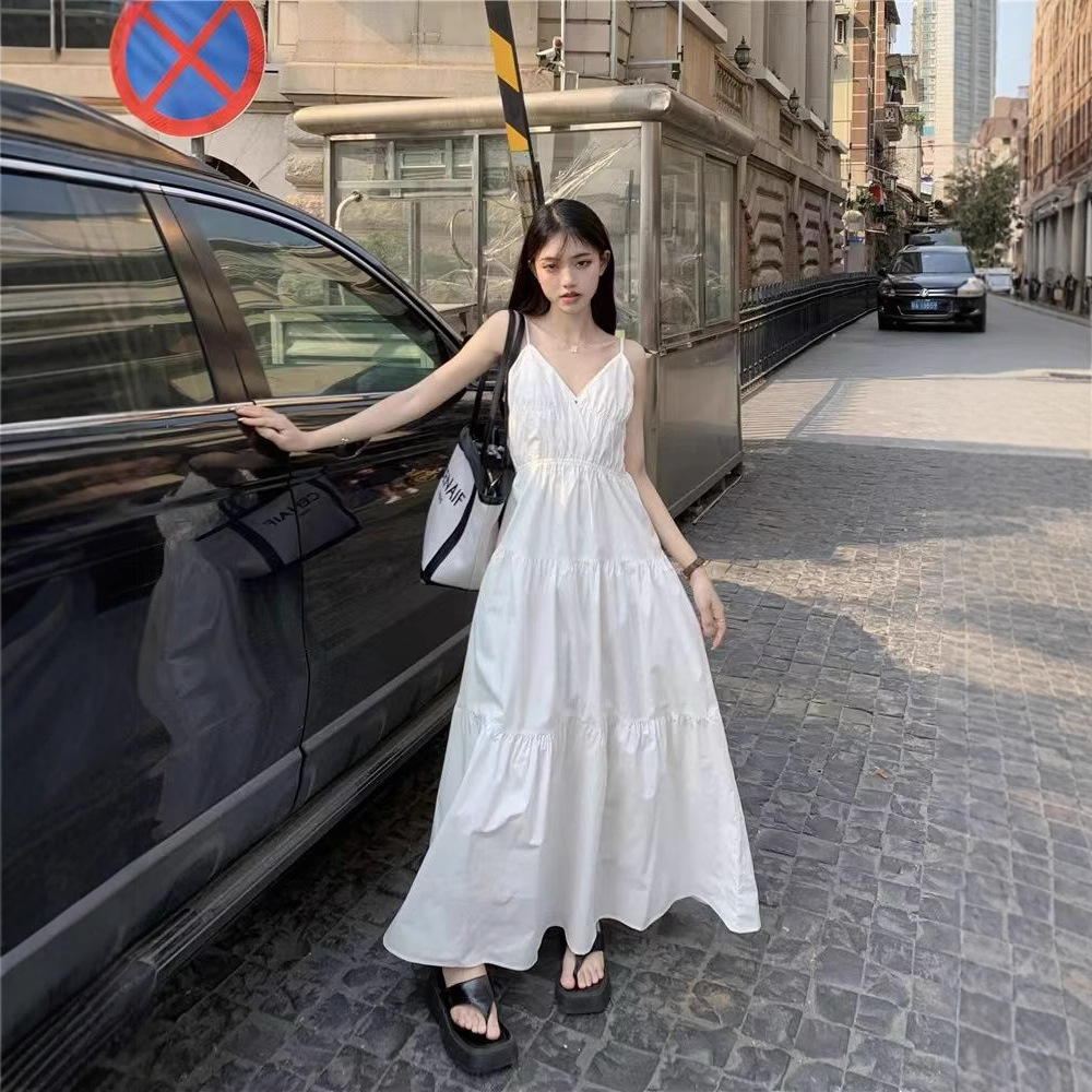 海辺のリゾートスタイル V ネックサスペンダードレス女性の夏の新しいスリムホワイトロングスカートフレンチビーチスカート