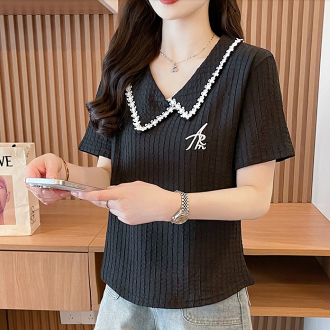 2025 新しいスタンドカラー Tシャツレディース半袖夏ファット mm ジャカードボタン中空デザインニッチトップ女性のトレンディな