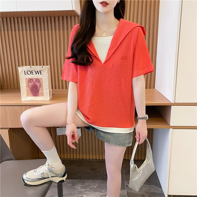 クロスボーダー半袖 Tシャツ女性のための 2025 新しい夏の韓国スタイルルーズ大きいサイズポロ襟偽ツーピースショートトップ女性のための