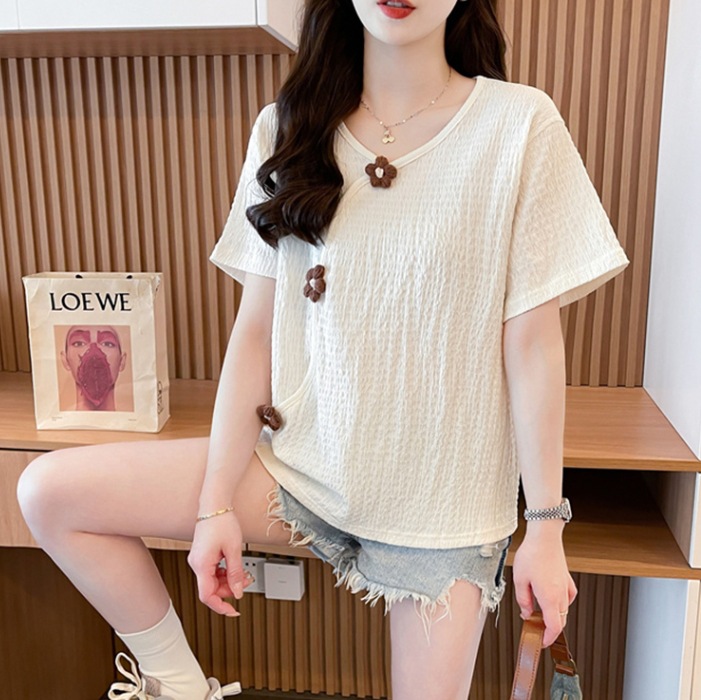2025 新ジャカード Tシャツレディースデザイン不規則な立体花夏大きいサイズ薄いショート V ネックトップ