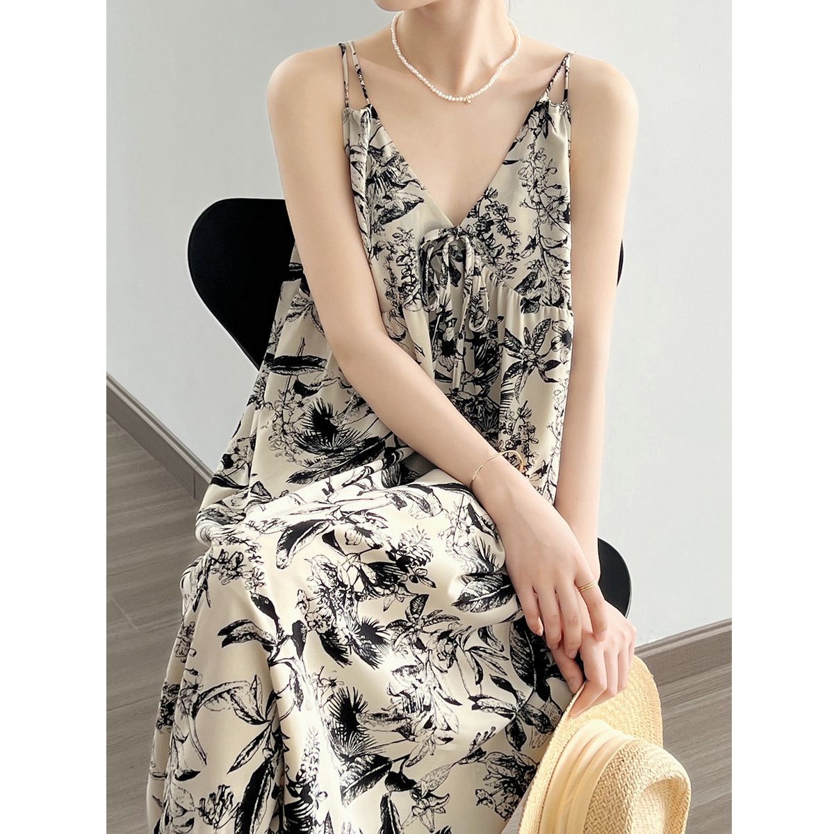 サスペンダードレス女性の夏 2025 水墨画花柄海辺休暇ビーチドレス夏のハイエンドロングスカート気質